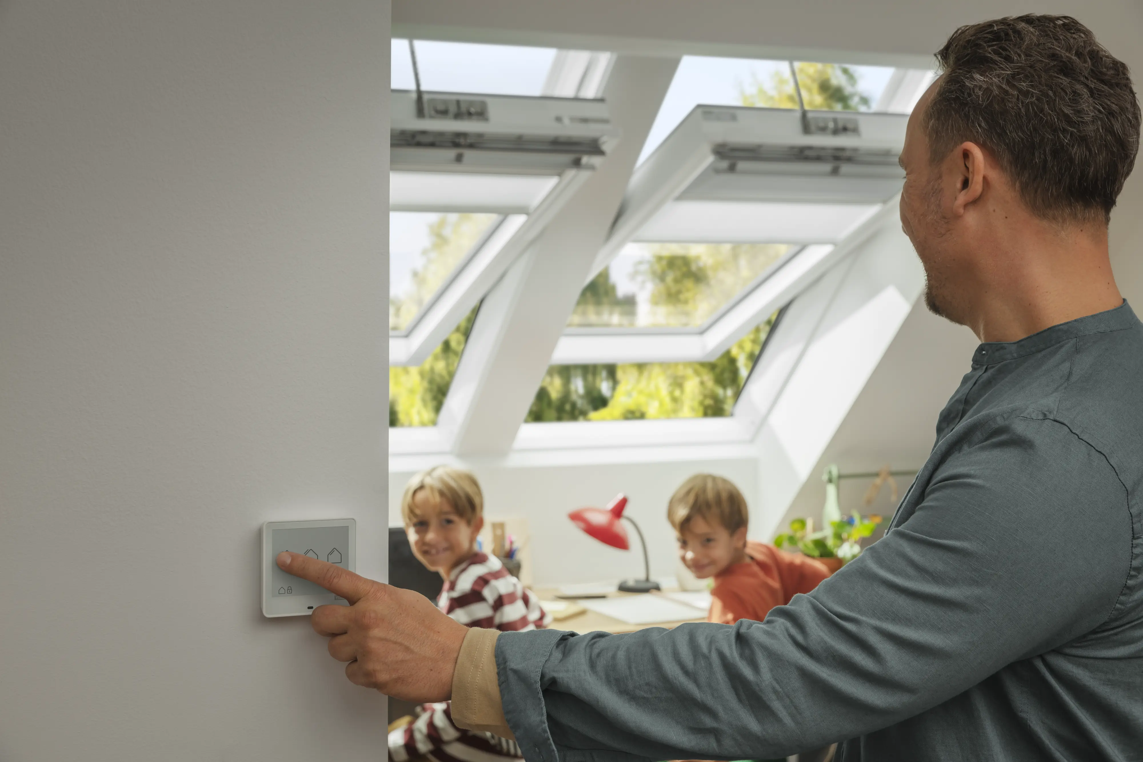 Otevírání střešního okna by nemělo být náročné. Proto každé elektrické i solární střešní okno VELUX dodáváme s předem spárovaným dálkovým ovladačem přímo v balení. Začneš větrat hned a kdykoli v budoucnu můžeš přidat ovládání přes aplikaci nebo sledování kvality vzduchu.