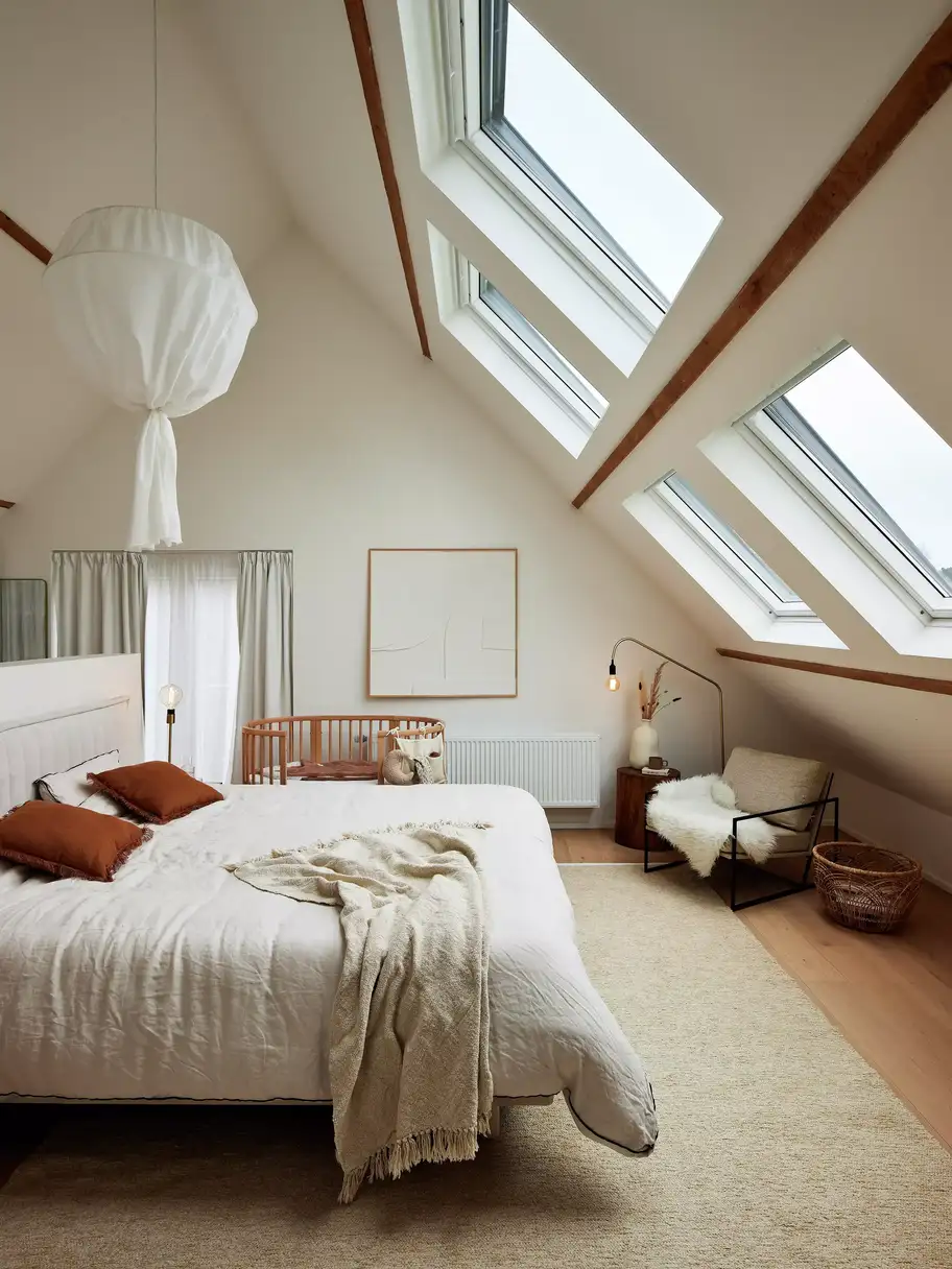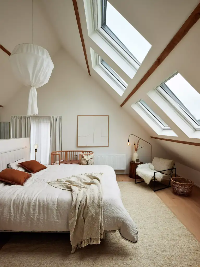 Dosáhni jednotného designu ložnice pomocí jemných kontrastů, jako je kombinace měkkých textilií s odkrytými dřevěnými trámy, pro větší pohodlí a styl.