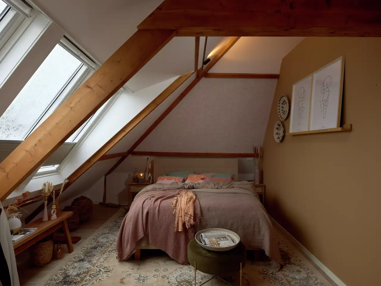 14. Jedním z typických znaků podkroví je, že obsahuje různé nízké prostory a výklenky, které se na první pohled zdají být nevyužitelné. Využijte je jako úložné prostory, aby zbývající prostor působil vzdušněji. Střešní konstrukci v interiéru nezakrývejte. Zviditelnění dřevěných konstrukčních prvků dodá prostoru zvláštní atmosféru, ať už je ponecháte v původním přírodním stavu, nebo je natřete.