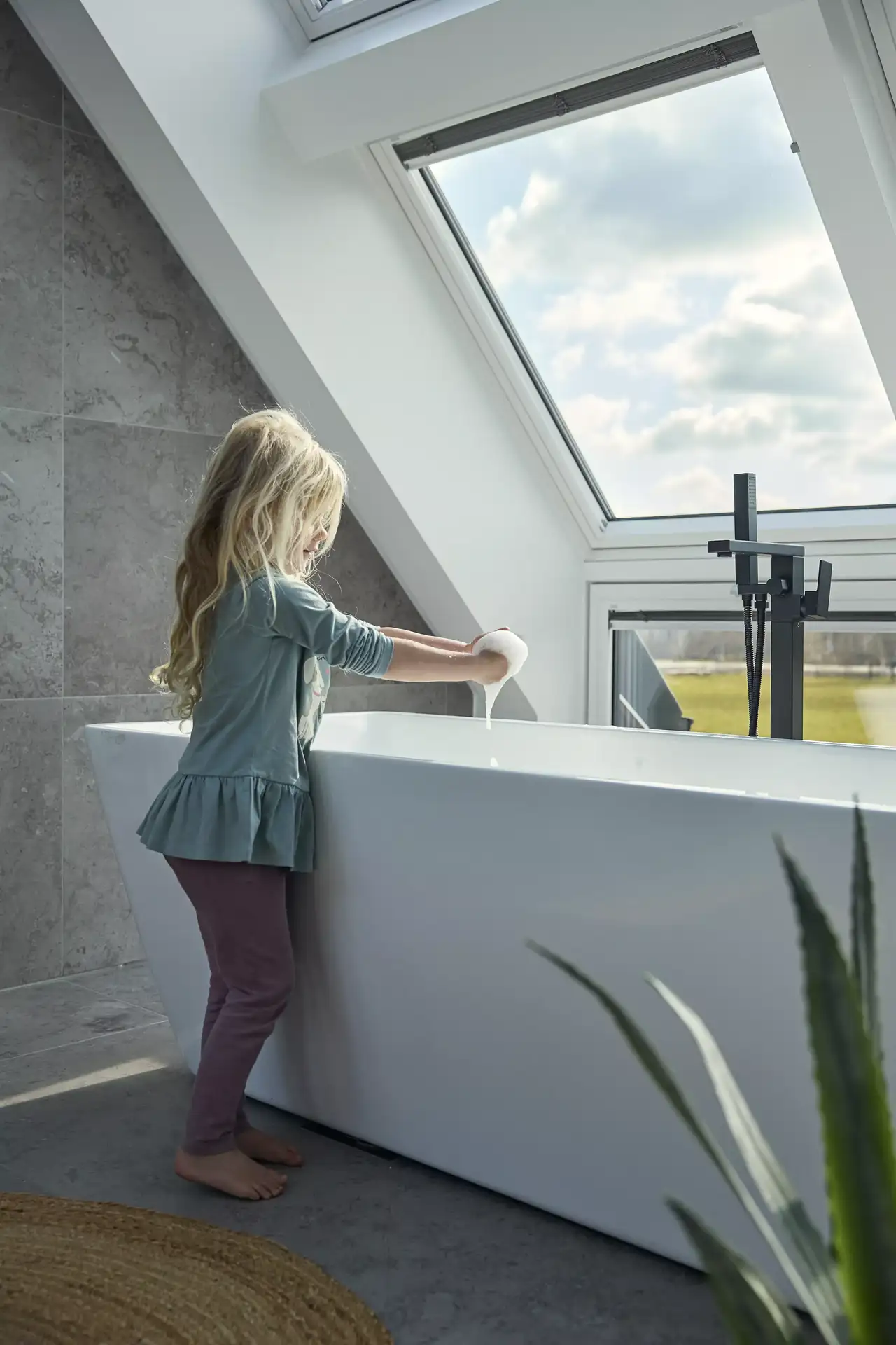 Pokud si necháte přidat střešní okno, ujistěte se, že jste si pro danou místnost vybrali správnou vnitřní povrchovou úpravu. Všechny horké koupele mohou z koupelny udělat velmi vlhký prostor, proto zvažte výběr střešního okna s polyuretanovou povrchovou úpravou odolnou proti vlhkosti. Kyvné střešní okno VELUX v bílé polyuretanové barvě má moderní bílou povrchovou úpravu, která se vám bude snadno ošetřovat, čistit a udržovat v suchu.